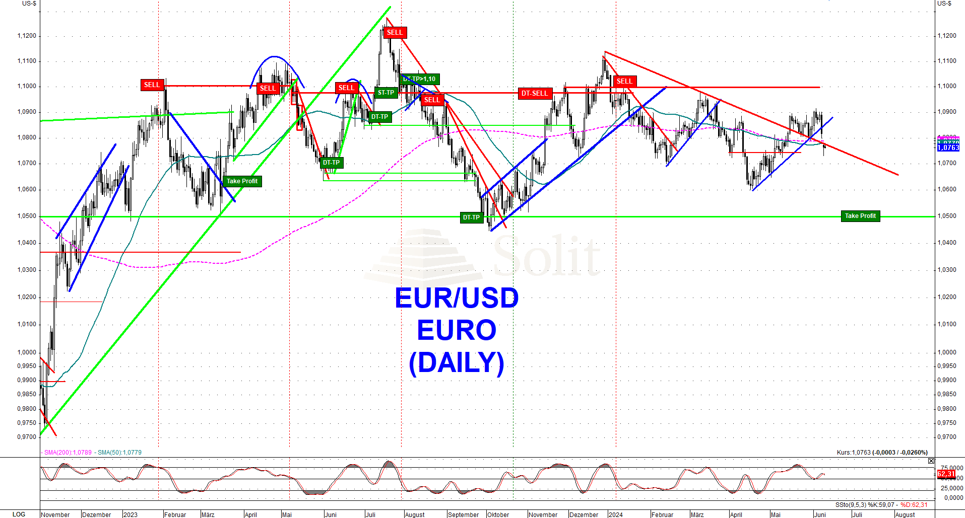 Die Arbeitsmarktdaten fielen am Freitag so gut aus und die Löhne waren so hoch, dass der Markt nun befürchtet, der September könnte für eine Zinssenkung der Fed zu früh sein, angesichts der bevorstehenden Wahlen in den USA. Der US-Dollar schoss daraufhin steil nach oben auf fast 105 Punkte im USD-Index, wogegen der Euro diametral gegensätzlich um einen US-Cent auf 1,08$ einbrach. Ich bleibe bärisch für den Euro und erwarte in den nächsten Wochen einen Test der Unterstützung bei 1,05$ und später im Jahr die Parität zum US-Dollar. Spätestens nach der frühen Zinssenkung der EZB fehlen jegliche fundamentalen Gründe für einen stärkeren Euro gegenüber dem US-Dollar. Investoren im Euroraum sollten daher weiterhin auf einen starken Goldpreis in Euro setzen.
