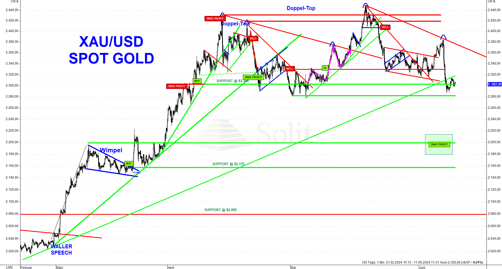 Zum Ende der letzten Handelswoche sank der Goldpreis um fast 100$ von seinem Höchststand, nachdem verschiedene Faktoren, besonders die sehr guten Arbeitsmarktdaten, ihn erheblich unter Druck setzten. Dabei fiel der Goldpreis unter die wichtige Unterstützung bei 2.330$ und durchbrauch auch seinen Aufwärtstrend.