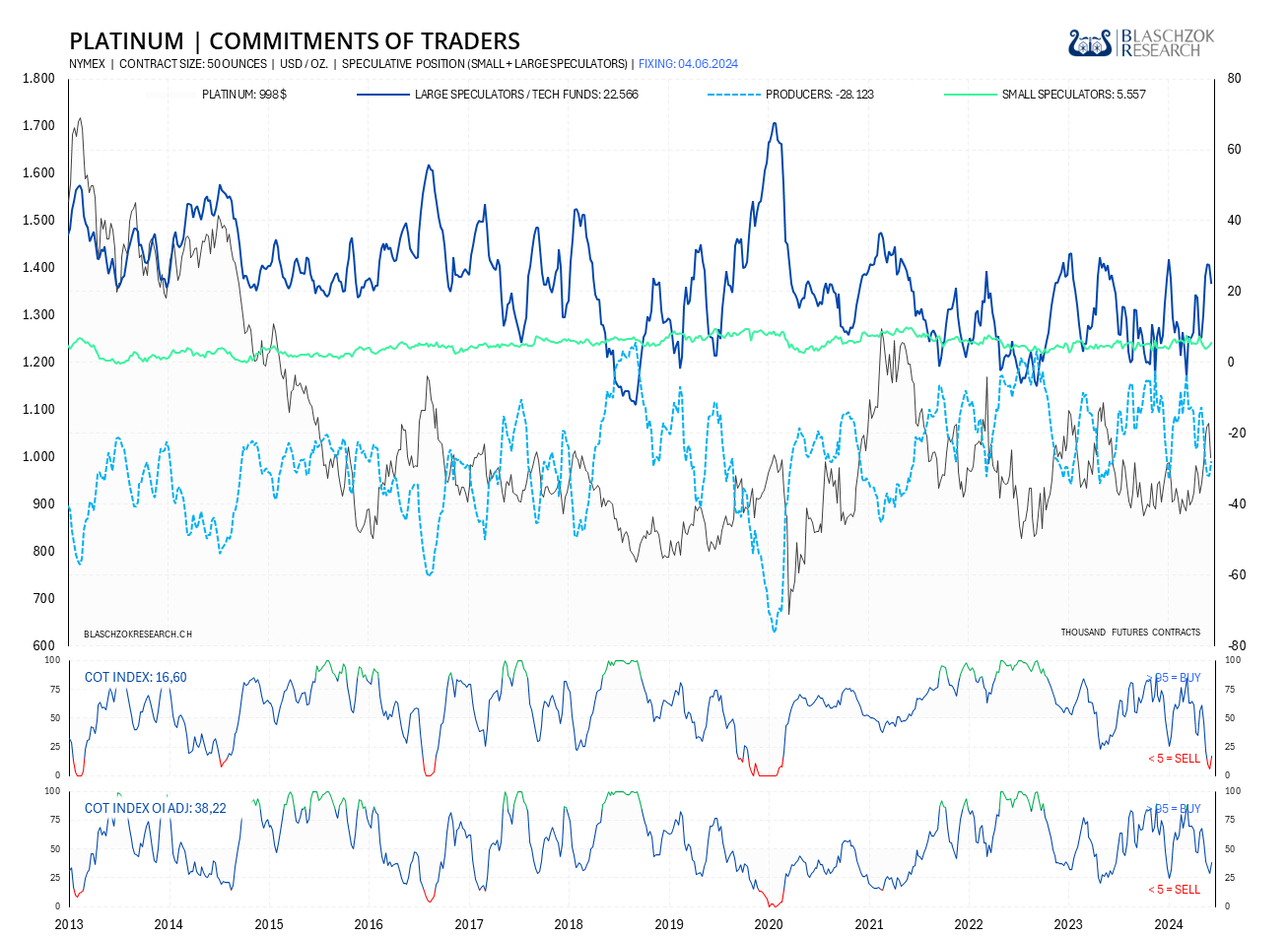 Der COT-Report wird immer freitags seitens der US-Terminmarktaufsicht (CFTC) veröffentlicht, wobei der Stichtag der Datenerhebung der Schlusskurs vom Dienstag ist. Die COT-Daten werden also immer mit einer Verzögerung von drei Tagen veröffentlicht. Premium Abonnenten von Blaschzok Research erhalten vor Handelsschluss am Freitag ein Blitzupdate mit Analysen zu Gold, Silber und Platin. Die COT-Daten ermöglichen einen Blick in die Zukunft, da sie einerseits ein Sentiment-Indikator sind und andererseits eine gute Einschätzung des Angebots und der Nachfrage am physischen Markt ermöglichen. Mit ihnen hat man einen Vorteil im Trading am Rohstoffmarkt.