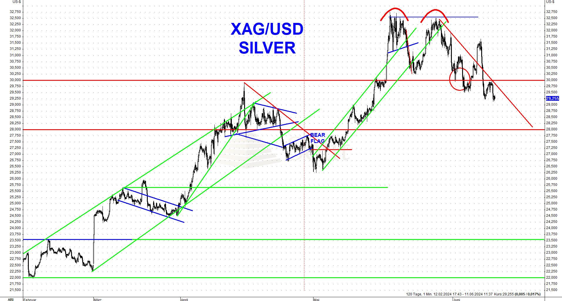 Am Freitagnachmittag zerstörten neue, sehr starke Arbeitsmarktdaten die Hoffnungen auf Zinssenkungen in den USA, ließen den US-Dollar stark ansteigen und führten zu weiteren Einbrüchen bei Gold- und Silberpreisen. Der Goldpreis hat mittlerweile die Unterstützung bei 2.280$ erreicht. Sollte diese Unterstützung in den kommenden Wochen brechen, so gäbe es weiteres Korrekturpotenzial bis 2.200$ je Feinunze.