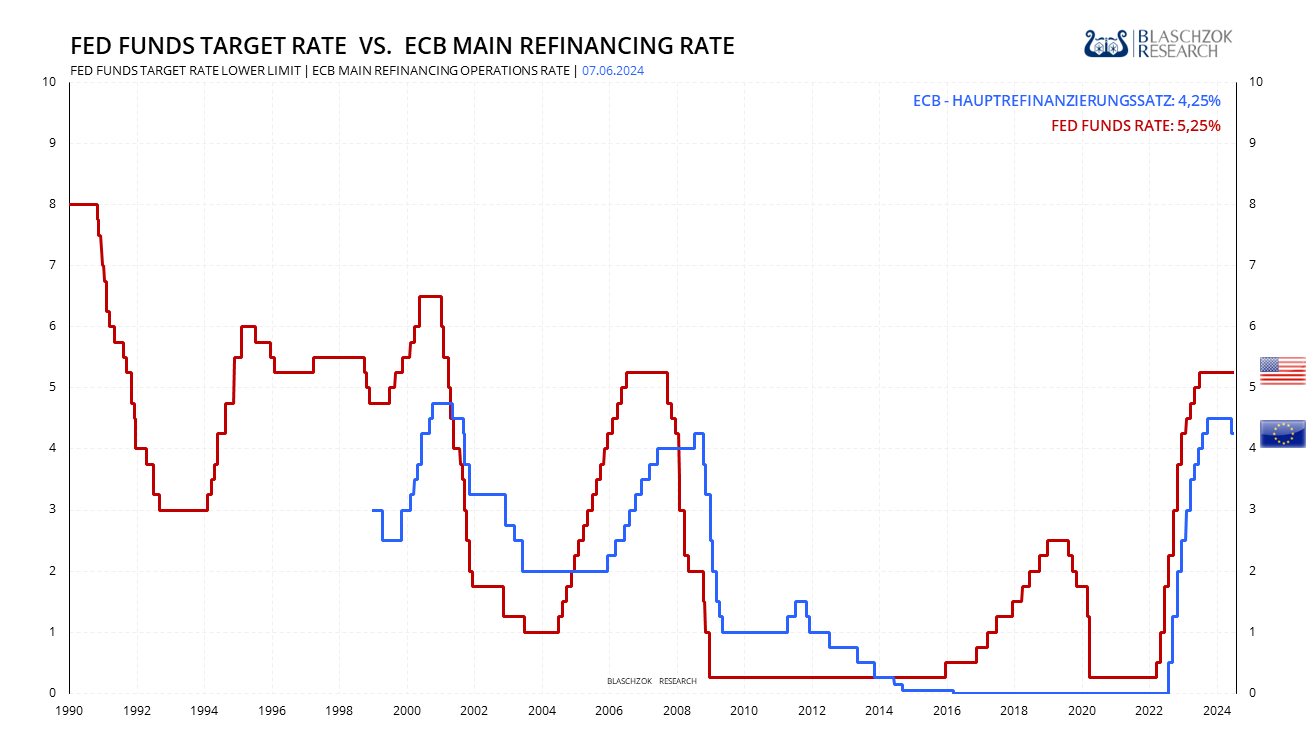 Die Zinssenkung wurde mit dem Rückgang der Inflationsrate seit September 2023 um mehr als 2,5 Prozentpunkte und der deutlichen Verbesserung des Inflationsausblicks begründet. Auch die Kerninflation war rückläufig und die Inflationserwartungen sind gesunken. Trotz der Fortschritte in den letzten Quartalen stellte die EZB jedoch fest, dass "der inländische Preisdruck aufgrund des hohen Lohnwachstums stark bleibt und die Inflation wahrscheinlich bis weit ins nächste Jahr hinein über dem Zielwert liegen wird. Die EZB-Projektionen für die Gesamtinflation und die Kerninflation wurden für 2024 und 2025 nach oben korrigiert. Die Gesamtinflation wird nun für 2024 bei 2,5% (2,4%), für 2025 bei 2,2% (2,0%) und für 2026 bei 1,9% (1,9%) gesehen. Die Zinsen wurden also gesenkt, obwohl die Inflationsaussichten angehoben wurden, was darauf hindeutet, dass das 2%-Inflationsziel nicht mehr oberste Priorität hat und als tot bezeichnet werden kann.