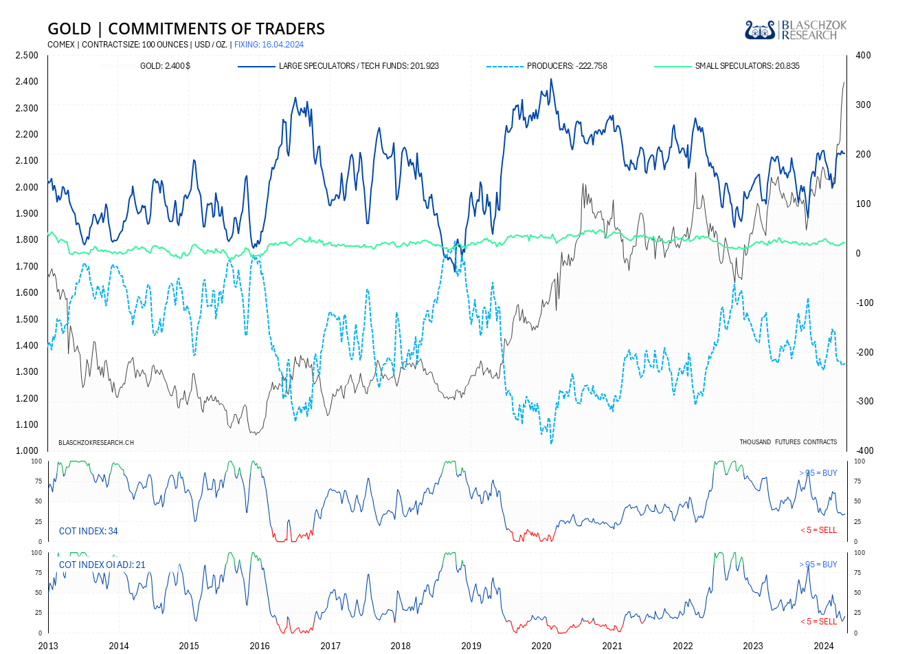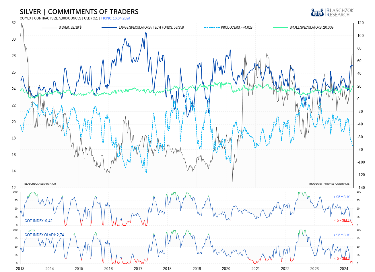 Der COT-Report wird immer freitags seitens der US-Terminmarktaufsicht (CFTC) veröffentlicht, wobei der Stichtag der Datenerhebung der Schlusskurs vom Dienstag ist. Die COT-Daten werden also immer mit einer Verzögerung von drei Tagen veröffentlicht. Premium Abonnenten von Blaschzok Research erhalten vor Handelsschluss am Freitag ein Blitzupdate mit Analysen zu Gold, Silber und Platin. Die COT-Daten ermöglichen einen Blick in die Zukunft, da sie einerseits ein Sentiment-Indikator sind und andererseits eine gute Einschätzung des Angebots und der Nachfrage am physischen Markt ermöglichen. Mit ihnen hat man einen Vorteil im Trading am Rohstoffmarkt.