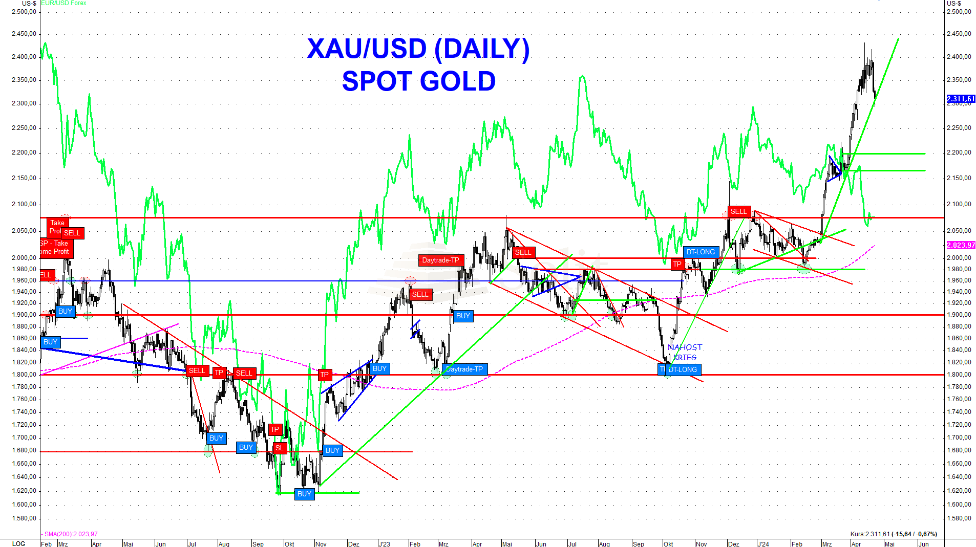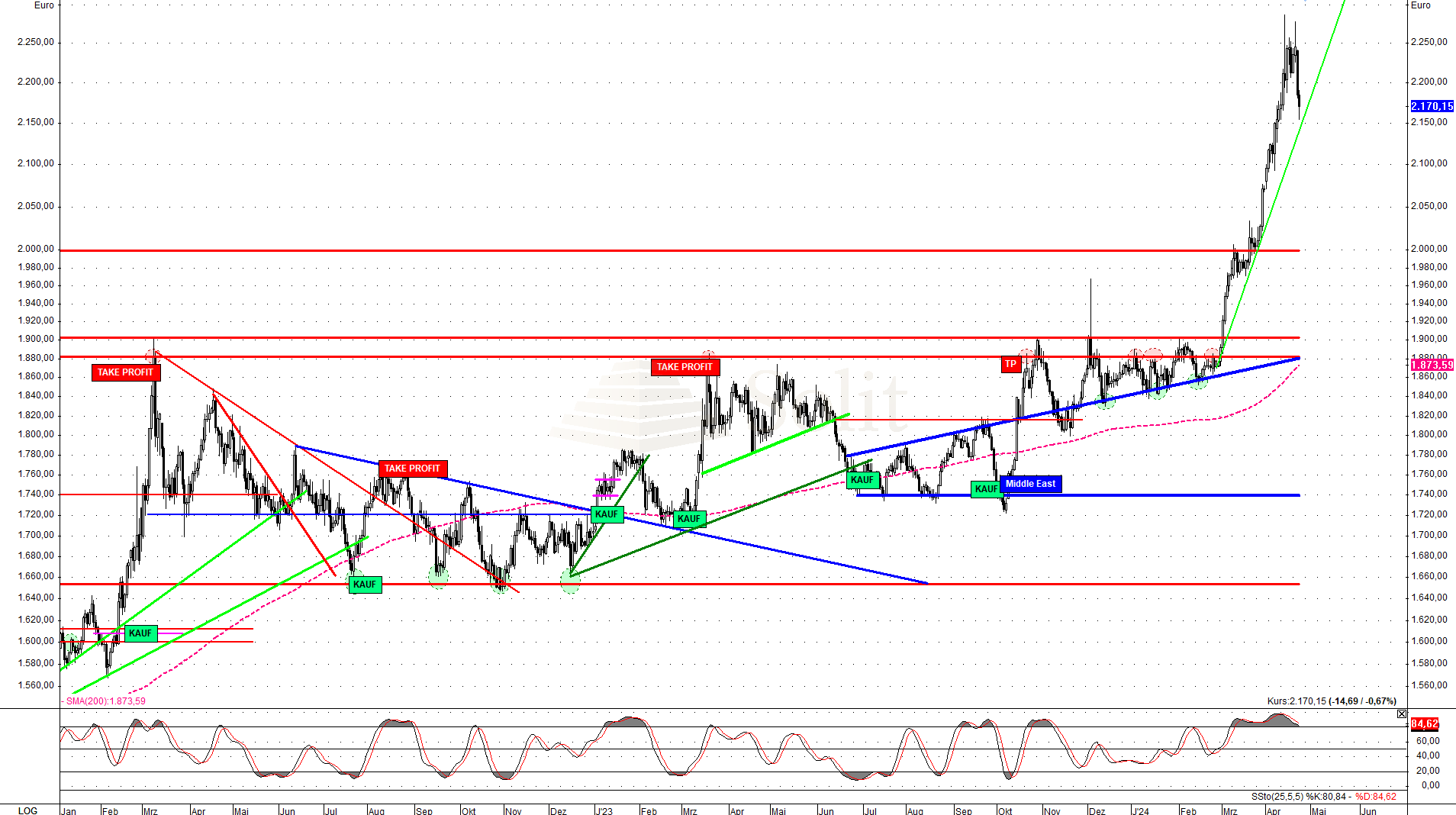 Ein Test des Aufwärtstrends und der Unterstützung im Bereich um die 2.180$ bis 2.150$ wäre kurzfristig ebenso denkbar. Unter 2.300$ gibt es ein neues kurzfristiges Verkaufssignal mit dem Ziel bei 2.220$, solange die Marke von 2.300$ nicht wieder überschritten wird, weshalb dort ein Stop-Loss nachgezogen werden muss.