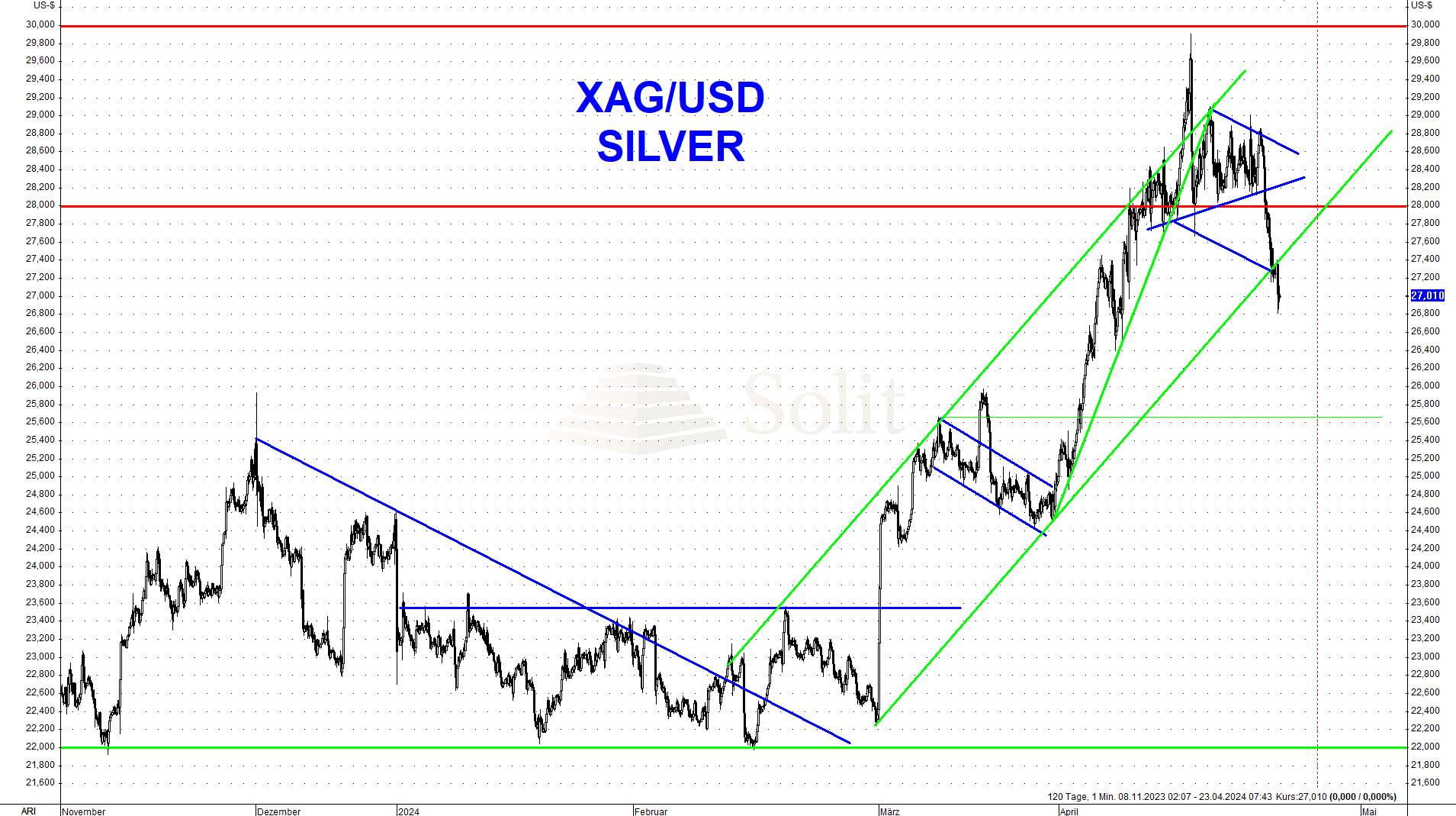 Am 12. April erreichte der Goldpreis ein Hoch bei 2.431$, worauf ein erster Einbruch folgte. Die Spekulanten kauften diesen Rücksetzer wieder, doch scheiterte dieser nun zum Wochenbeginn mit einem erneuten Bruch eines kurzfristigen Aufwärtstrends, wobei ein Doppel-Top ausgebildet wurde. Dies ist ein charttechnisch kurzfristig bärisches Bild, das für mehr Korrekturpotenzial spricht. Noch gibt es eine starke physische Nachfrage, doch sobald diese abebbt, droht sich die Korrektur auszuweiten.