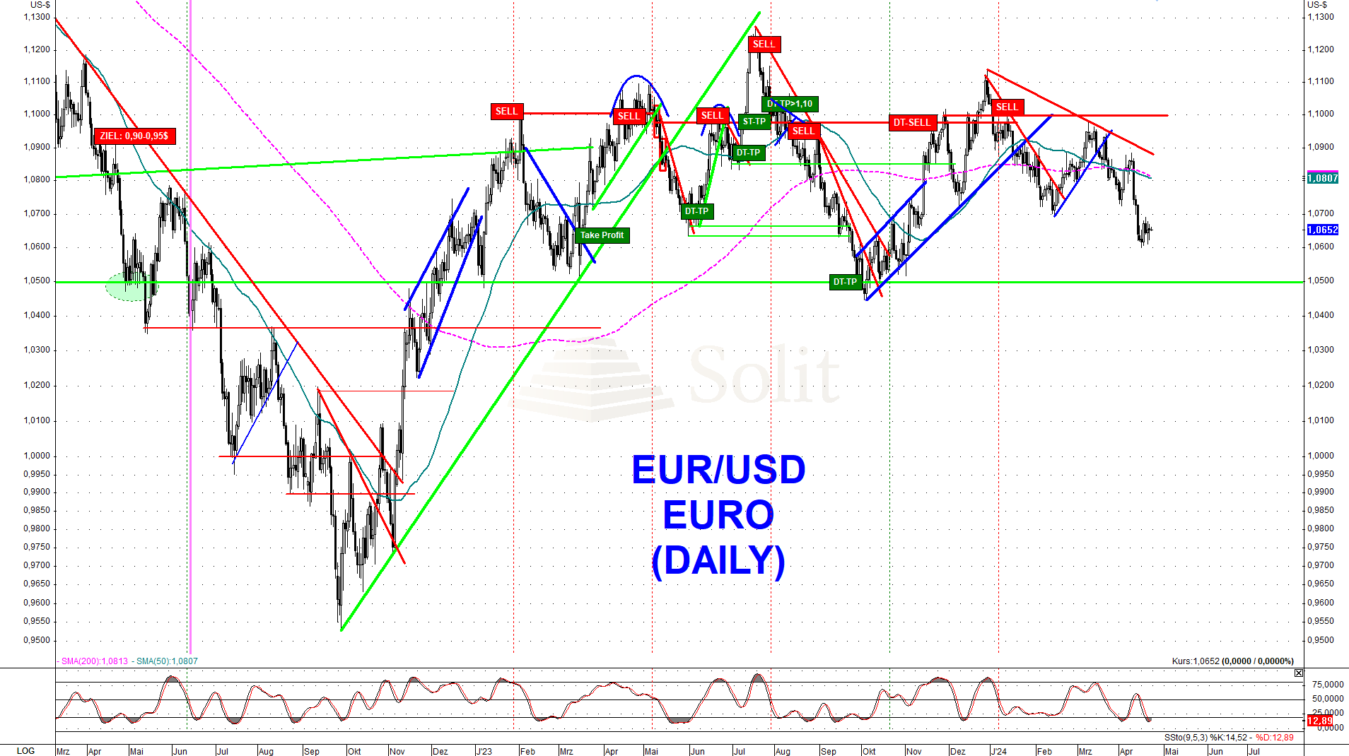 Aktuell verarbeiten die Märkte noch immer die Enttäuschung über das Ausbleiben der ursprünglich erhofften und eingepreisten acht Zinssenkungen für dieses Jahr, von denen aktuell bestenfalls zwei stattfinden werden. Entgegen dem Marktkonsens prognostizierte ich im letzten Jahr unentwegt, dass die Zinsen oben bleiben dürften und sogar deutlich weiter ansteigen werden, sollten die Notenbanken auf eine Rezession mit quantitativen Lockerungen reagieren. Da einige Notenbanker mittlerweile von Zinsanhebungen sprechen behielt ich mit meiner Meinung recht. Da die Zinsen in Europa niedriger sind als in den USA und man nun von ersten Zinssenkungen in Europa ausgeht, steigt der US-Dollar weiter an und erreichte mittlerweile 106 Punkte im USDX. Ein Anstieg auf 114 Punkte im USD-Index scheint in diesem Jahr durchaus möglich zu sein. Diametral gegensätzlich dürfte der Euro wieder zurück auf die Parität zum US-Dollar fallen, wobei auch ein Wechselkurs deutlich darunter durchaus realistisch sein dürfte. Ich hatte mit meinen Abonnenten den USD-Index bei 100 Punkten und bei 101 Punkten gekauft, während wir den Euro im letzten Jahr stets bei 1,10$ verkauft haben.