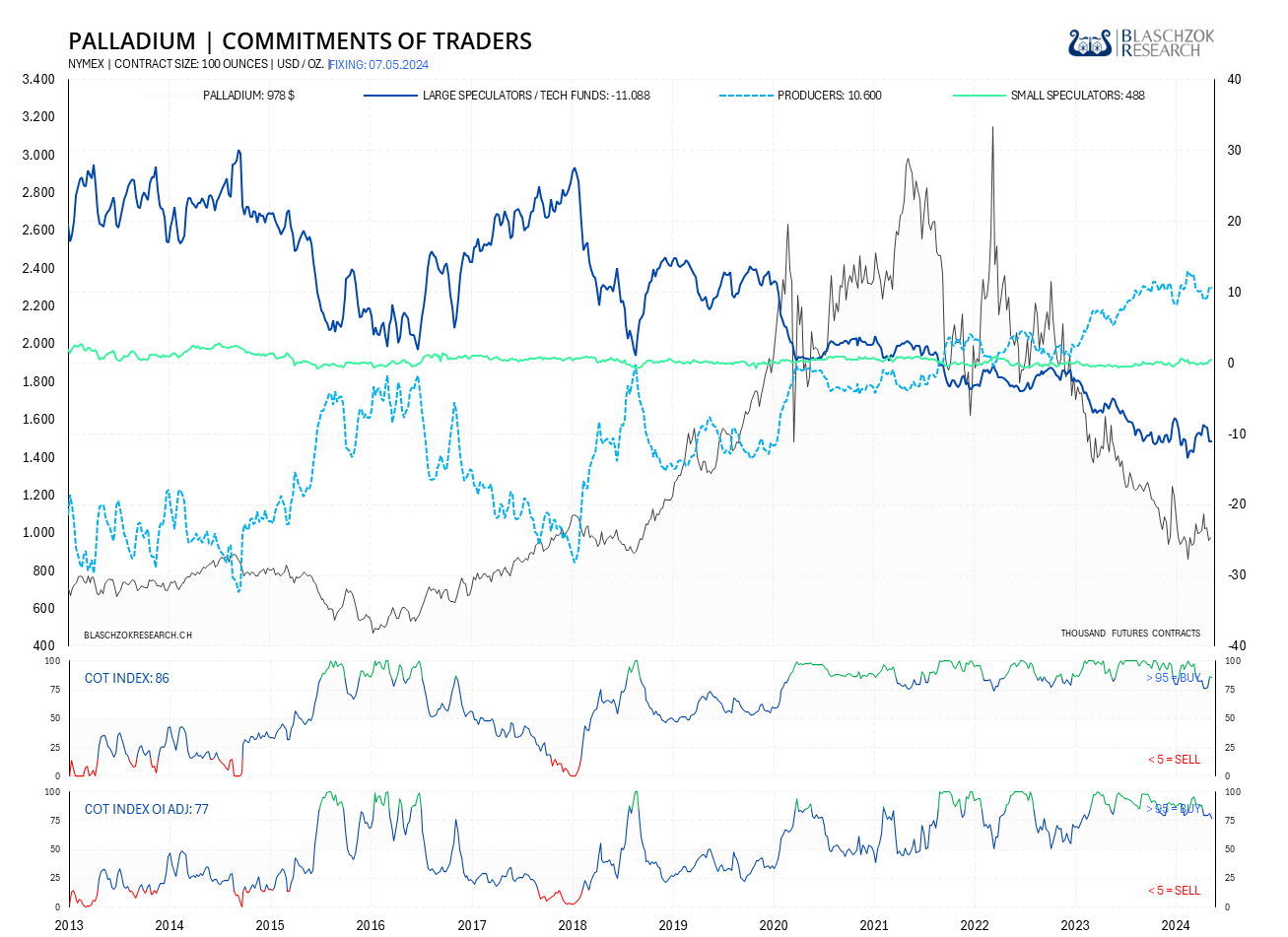 Der neueste Terminmarktreport zeigte kaum eine Veränderung zur Vorwoche und die Entwicklung zur Woche davor ist absolut neutral, wobei sich zum Open Interest eine leichte Schwäche zeigte. Der COT-Index OI fiel mittlerweile auf 77 Punkte. Kein Grund optimistisch und euphorisch für Palladium zu sein. Sieht danach aus, als würde sich die trendlose Seitwärtsphase erst einmal fortsetzen und wir mit einer Rezession einen starken Preiseinbruch bekommen. Noch gibt es keinen Grund für Optimismus.