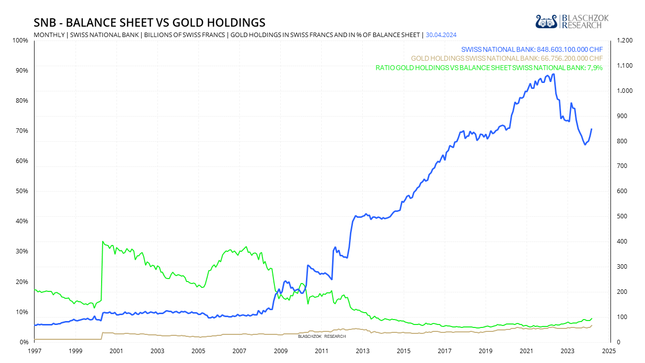 Aufgrund der Gelddruckorgie der SNB seit 2008 sank die Golddeckung des Franken auf heute nur noch 7,9% ab. Hätte man die Golddeckung nicht aufgehoben, so wäre der Franken heute wohl dreimal so stark, wie er es aktuell ist. Dass der Franken seit 2008, trotz der starken Abwertungen von US-Dollar und Franken nur noch marginal aufgewertet hat, ist der Geldpolitik der SNB und ihrer gezielten Abwertung des Franken zu verdanken.