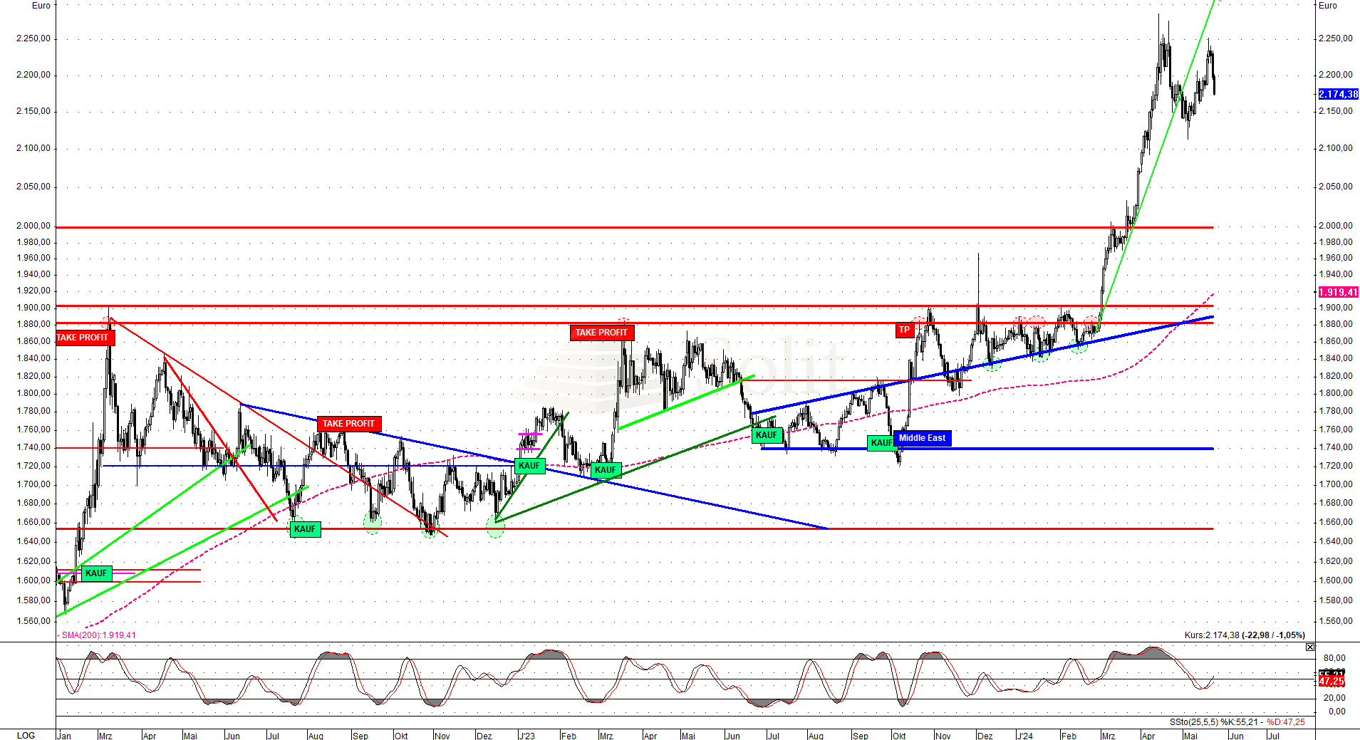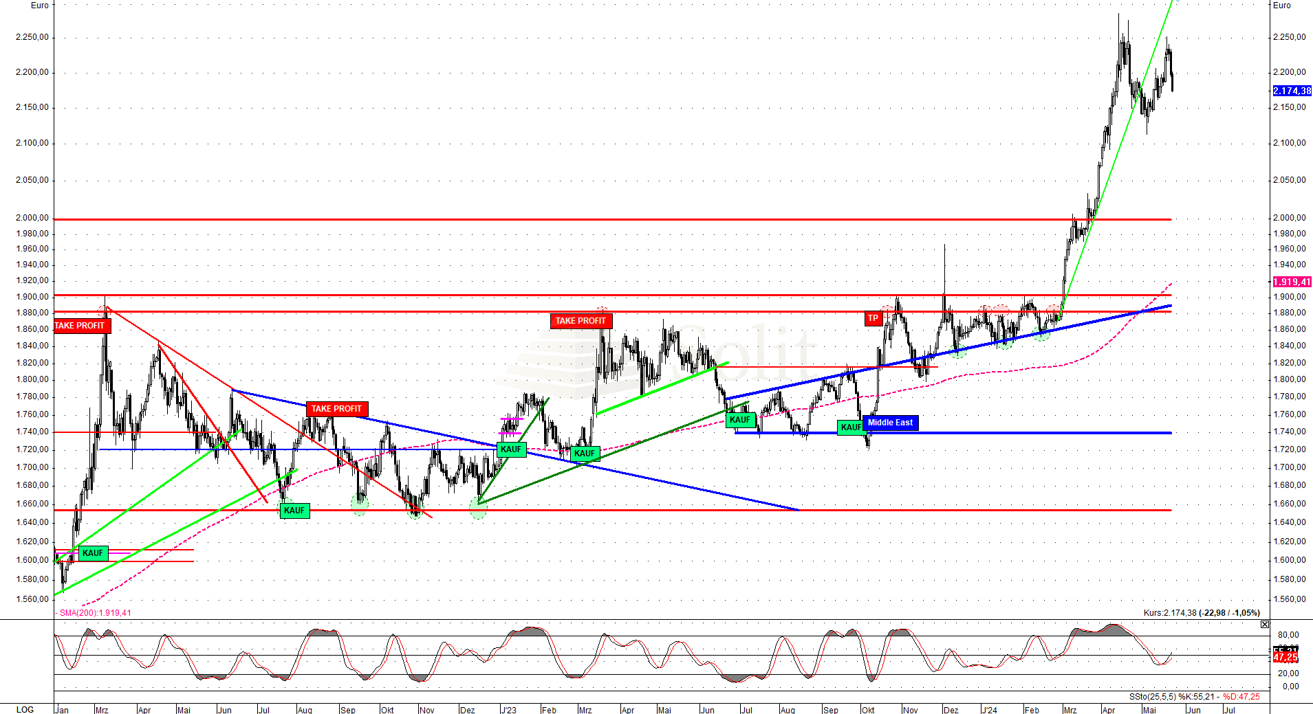 Während im letzten Jahr ein Rücksetzer auf 1.740€ eine Kaufchance darstellte, sollte man nun einen möglichen Rücksetzer auf 2.000€ je Feinunze als möglicherweise letzte Kaufchance sehen. Nur in einem starken deflationären Crash an den Börsen wäre eine Korrektur unter 1.900$ noch denkbar, was ein Geschenk für Investoren wäre. Die Wahrscheinlichkeit für eine solche Korrektur ist jedoch eher gering.