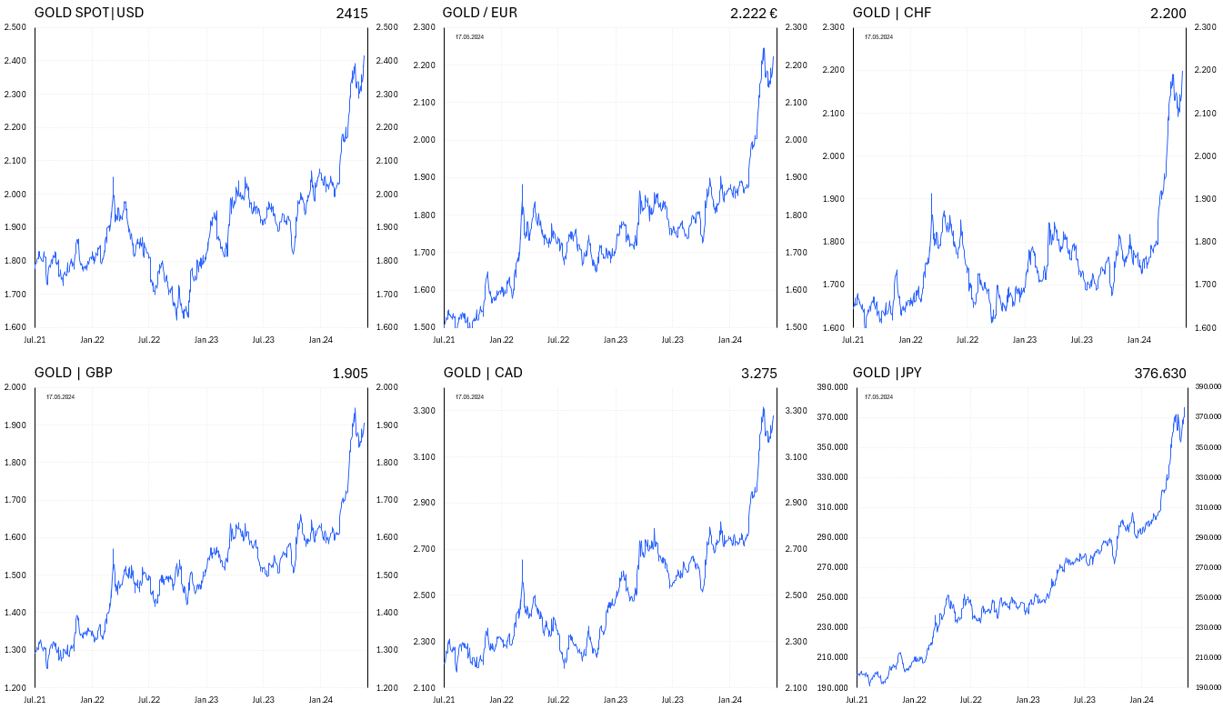 Der Goldpreis stieg in der vergangenen Handelswoche um 2,3% auf 2.415$ an, womit ein neues Allzeithoch auf Basis von Tages- und Wochenschlusskursen erreicht wurde. Am Montag wurde im frühen asiatischen Handel dann auch ein neues Intraday-Allzeithoch bei 2.450$ je Feinunze erreicht. Immer mehr Anleger, Mainstream-Investoren und Fonds, die die Rallye verpasst haben, sind plötzlich von den Argumenten für Gold überzeugt und wollen spät noch einsteigen, obwohl der Markt reif für eine gesunde Korrektur wäre, bevor sich die Hausse am Goldmarkt fortsetzen dürfte.
