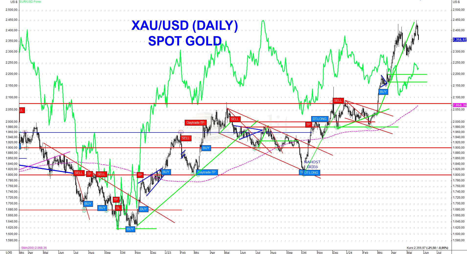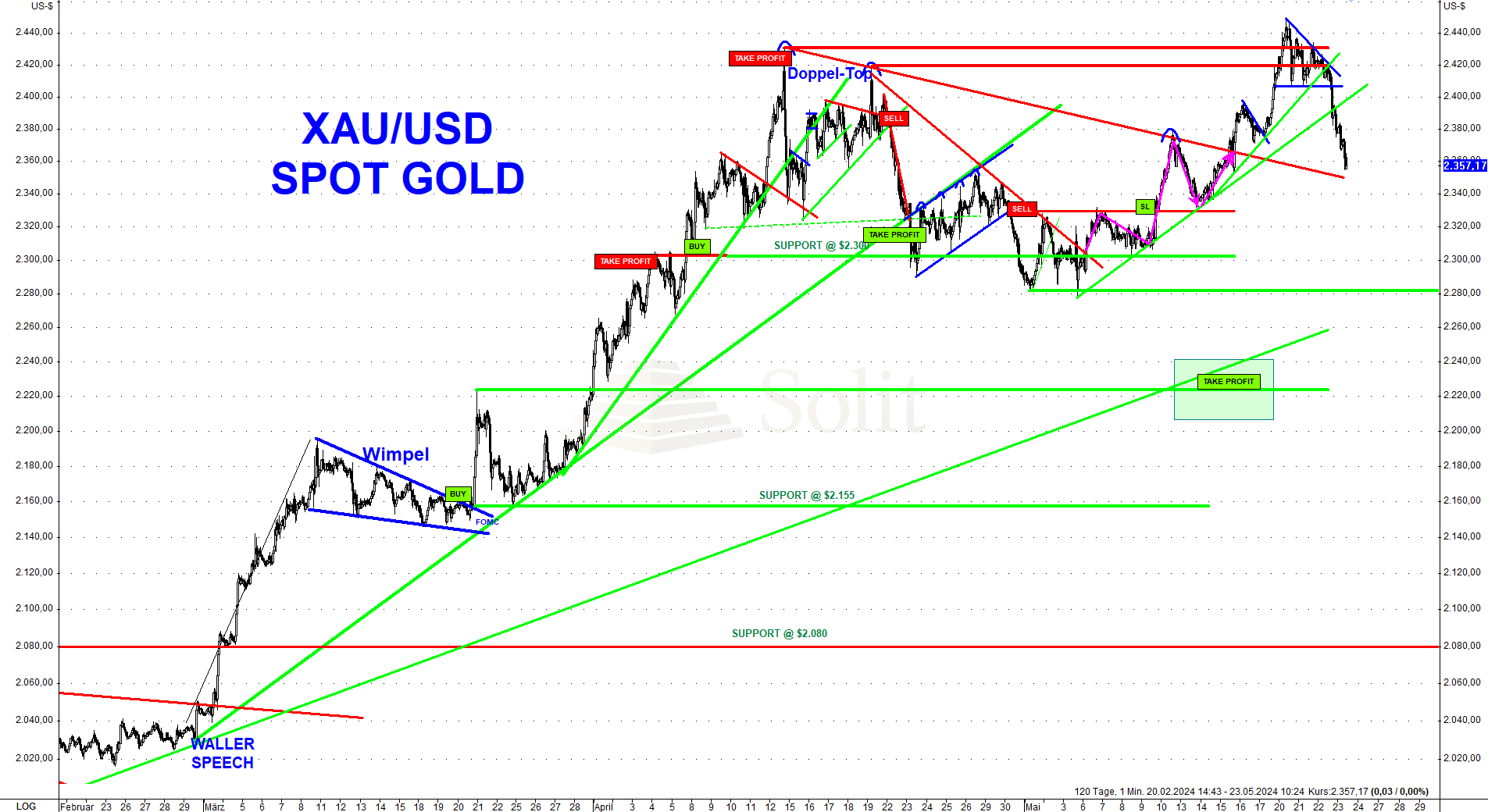 Charttechnisch achteten Spekulanten auf den kurzfristigen grün eingezeichneten Aufwärtstrend, denn nachdem dieser brach, könnte sich eine erneutes Doppel-Top ausbilden und ein erneuter Rücksetzer auf 2.280$ ist nun auf dem Tisch. Die letzte Unterstützung ist der Abwärtstrend bei 2.350$, der jetzt halten muss. Hält dieser, so handelt es sich um einen Pull Back an das Ausbruchsniveau und der Preisanstieg könnte sich fortsetzen, wofür die Stärke der letzten beiden Wochen spricht.