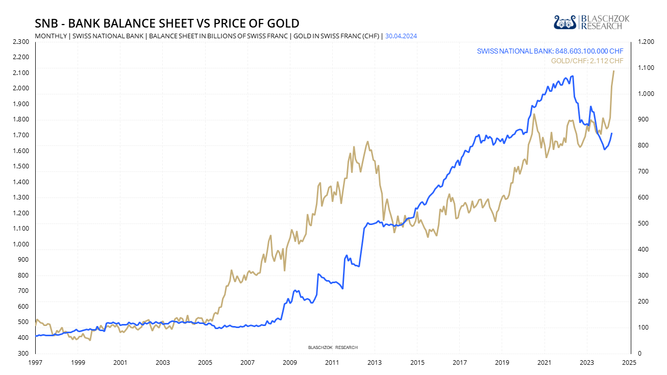 Die Golddeckung des Schweizer Franken fand jedoch am 1. Mai 2000 ihr Ende, als sie im Zuge einer umfassenden Reform der SNB und der Währungsreserven aufgehoben wurde. Nachdem der Schweizer Franken vom Gold gelöst und in eine Fiat Währung ohne Deckung umgewandelt wurde, hatte die SNB freie Hand den Franken jederzeit abzuwerten. Es dauerte nicht lange, bis dieser Sündenfall eintrat und die SNB in 2008 damit begann ihre Geldmenge beispiellos auszuweiten. Die Notenbankbilanz der SNB explodierte seither förmlich auf das 11-fache im Jahr 2022. Selbst die Geldmengenausweitung der US-Notenbank war mit einer Verachtfachung in der Spitze relativ betrachtet geringer als die der SNB.