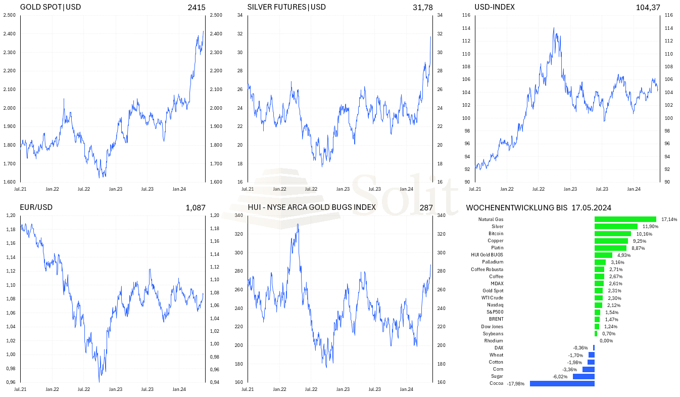 Die Edelmetallpreise wurden in der letzten Woche durch gesunkene Inflationszahlen aus den USA getrieben, was aus Marktsicht die Wahrscheinlichkeit auf Zinssenkungen erhöhte. Die US-Verbraucherpreise stiegen im April nur um 0,3% zum Vormonat an, was weniger als die 0,4% waren, die der Markt erwartet hatte. Jedoch trafen die Jahresrate mit 3,4%, die Kernrate mit 0,3% zum Vormonat und 3,6% zum Vorjahr exakt die Markterwartung. Fed-Chef Powell stellte vergangene Woche in einer Rede klar, dass es keine weiteren Zinsanhebungen geben wird, was die Börsen feierten. Die Marktteilnehmer sind nun der Ansicht, dass sich nicht mehr die Frage stellt, ob die Leitzinsen gesenkt werden, sondern nur noch wann.