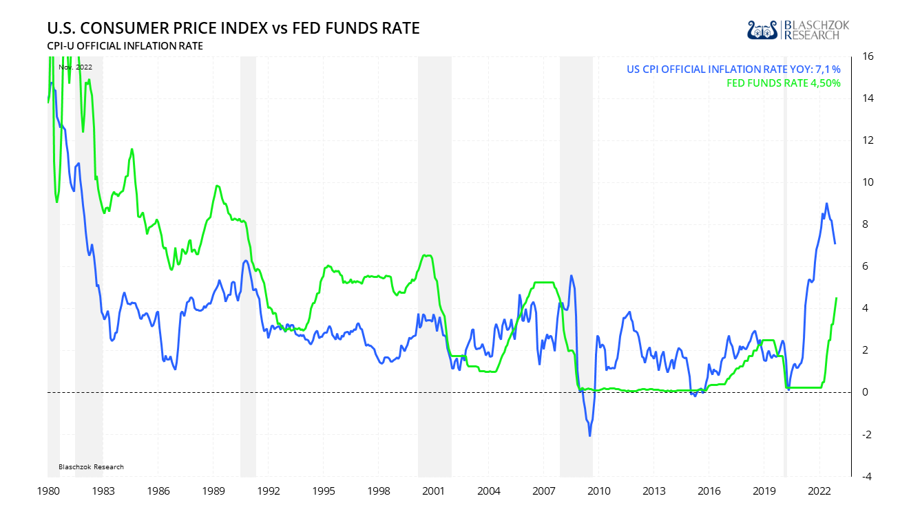 Da die Schulden von Staat und Privatwirtschaft hoch sind und sich in der letzten Dekade der Nullzinsen historisch einmalig große Fehlallokationen in der Wirtschaft aufgetürmt haben, würde dies die aufziehende Rezession nur noch verschärfen.