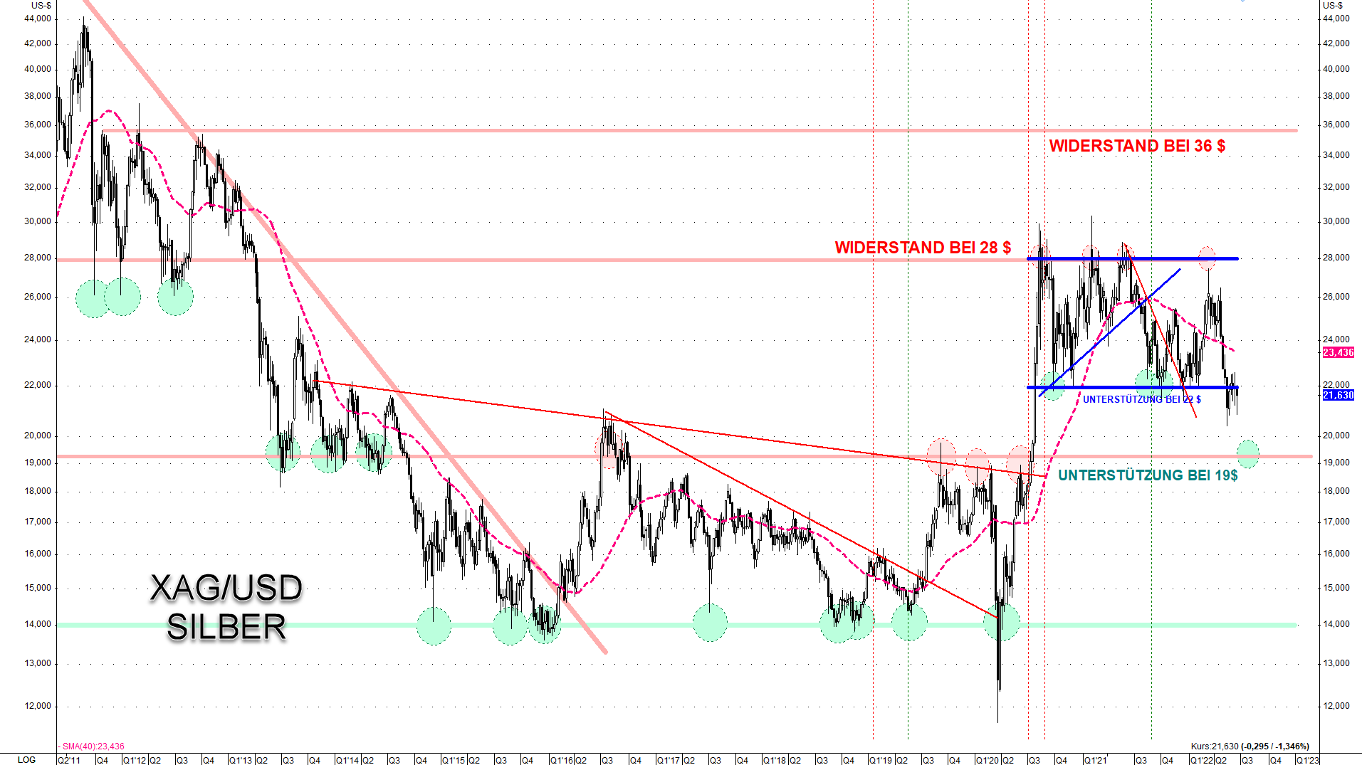 Die Edelmetallpreise konnten sich in der letzten Woche im Umfeld eines schwächeren US-Dollars erholen. Silber stieg wieder an den Widerstand bei 22$. Bärmarktrallye oder Start eines neuen Impulses?