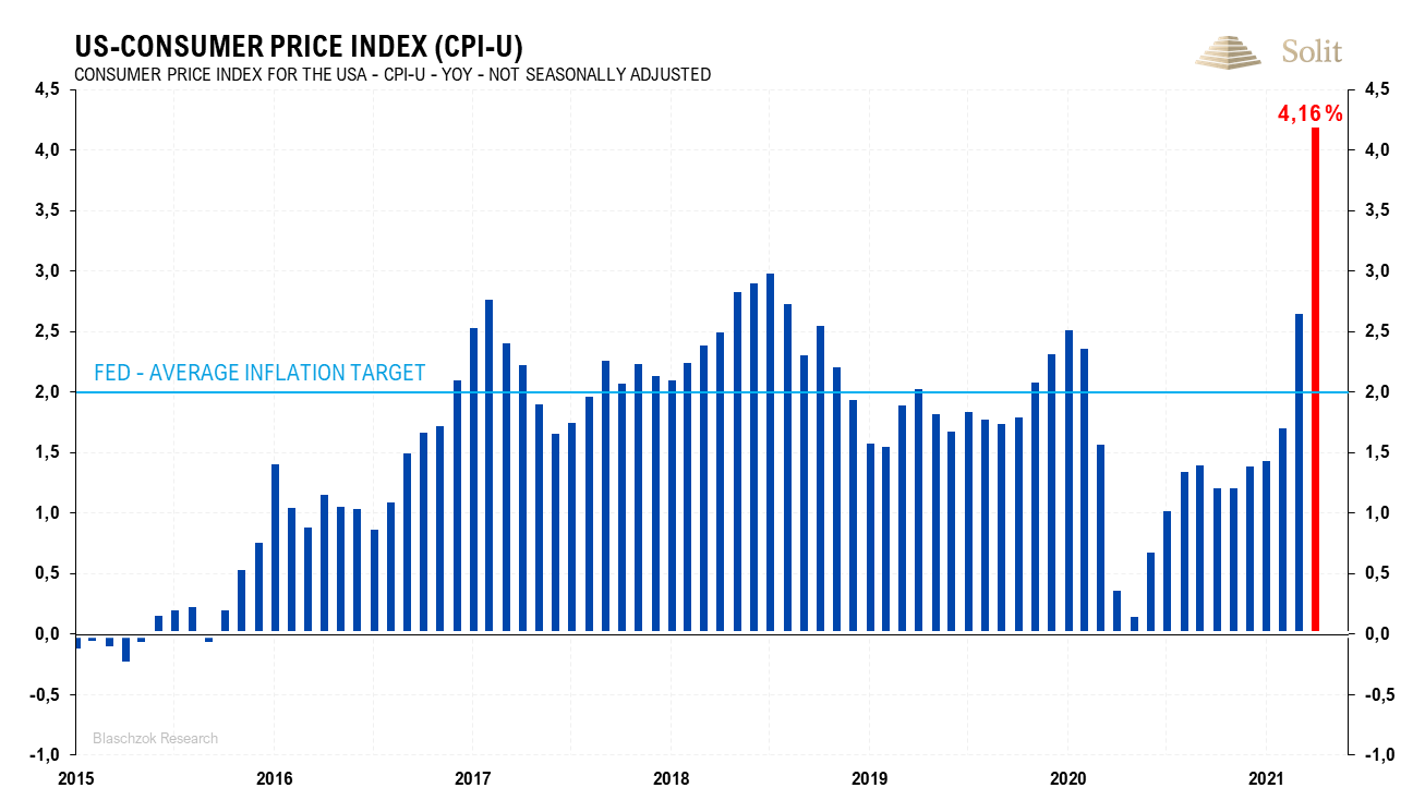 Die Verbraucherpreise stiegen im April um 4,2 Prozent zum Vorjahr an. Dies übertraf den Marktkonsens von lediglich 3,6 Prozent deutlich, nachdem im März die Preise „nur“ um 2,6 Prozent anstiegen.