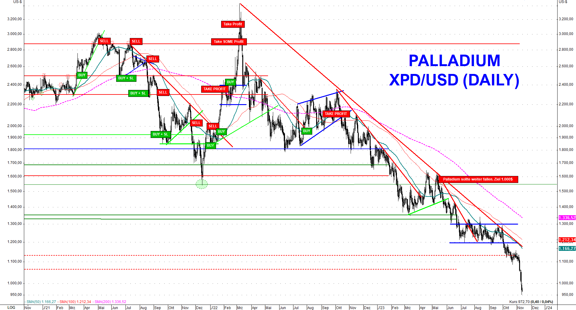 Der Palladiumpreis fiel bereits um 70% kurzzeitig auf unter 1.000$. Im nächsten Jahr wird ein Überschuss erwartet und eine Rezession steht bevor. Nicht gerade ein Setup, um in das fallende Messer zu greifen.