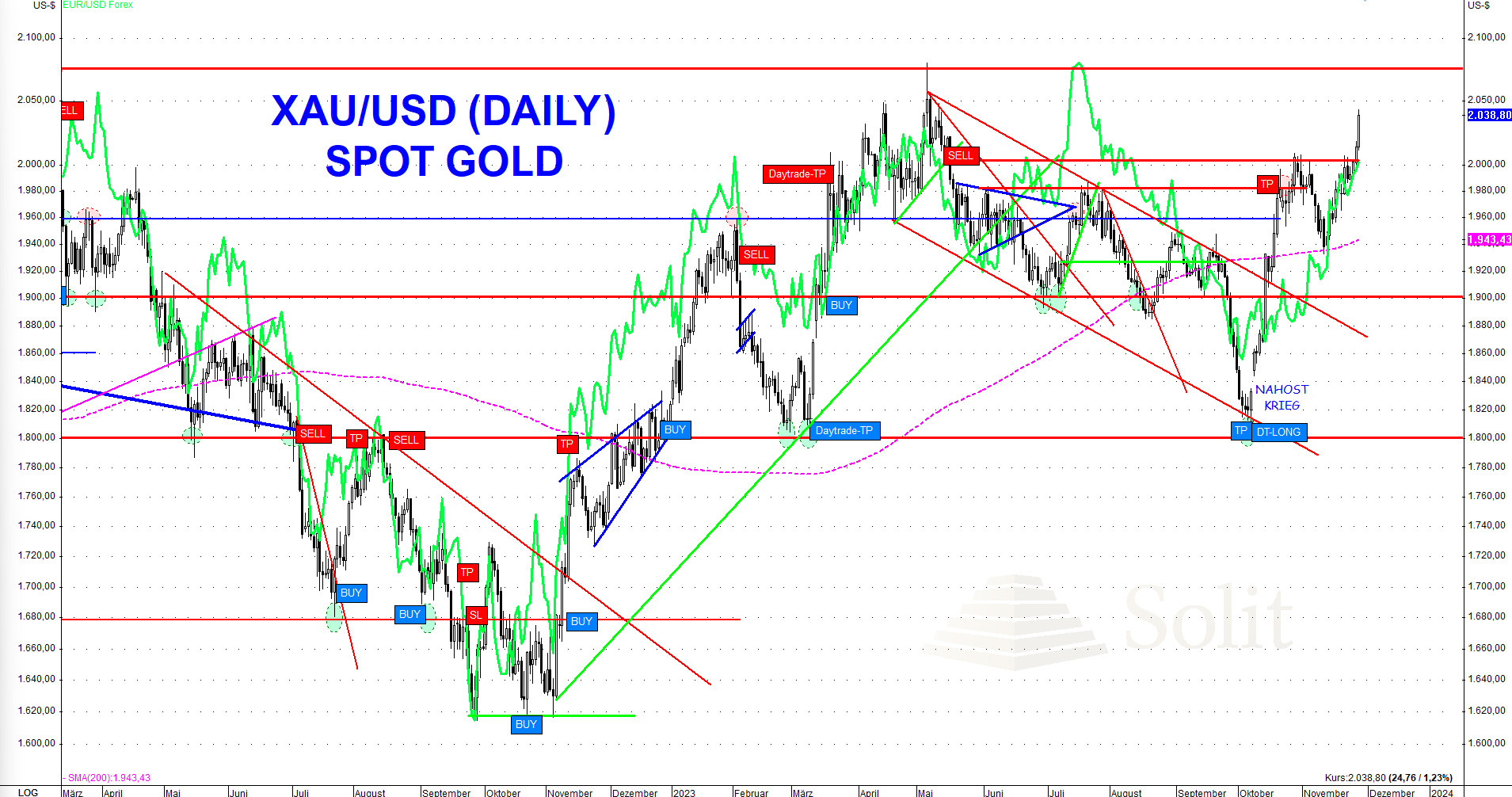 In der von geringem Handelsvolumen geprägten letzten Handelswoche rund um den US-Feiertag „Thanksgiving“ gelang es dem Goldpreis über den Widerstand bei 2.000$ auszubrechen und mittlerweile auf ein 6-Monatshoch bei 2.043$ anzusteigen. ..