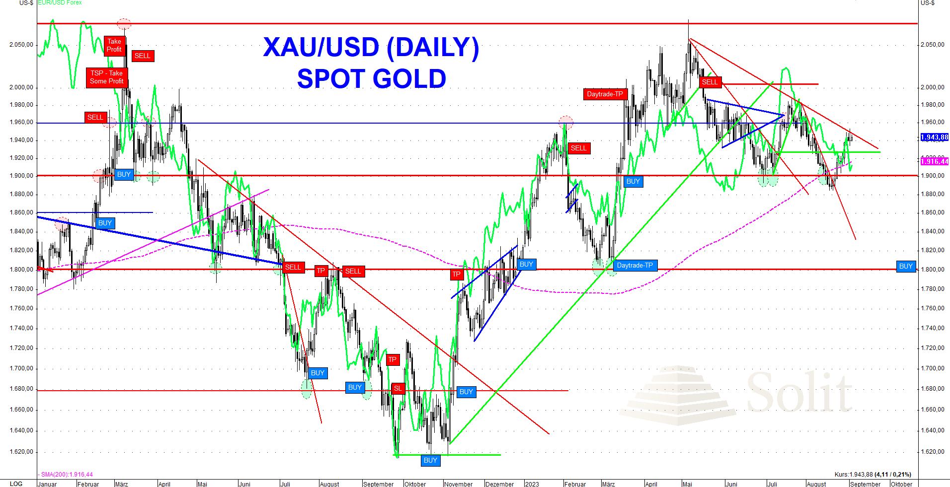 Kurzfristige Hoffnung für den Goldpreis gibt es aktuell an der Unterstützung bei 1.900$. Sollte der USD-Index erst einmal an dem Widerstand bei 103 Punkten scheitern, so wäre es möglich, dass die Goldbullen erneut zum Angriff blasen.
